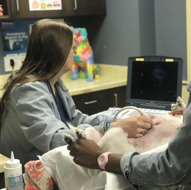 Ultrasound is a non-invasive imaging tool that allows us to view your pet’s internal organs in real time. It is commonly used to evaluate abdominal structures such as the liver, kidneys, bladder, intestines, and spleen. In other situations, ultrasound may also be used to assess the heart or look for fluid within the chest or abdomen. This imaging tool provides detailed information about soft tissues and is often used alongside other diagnostics to help guide diagnosis and treatment planning.